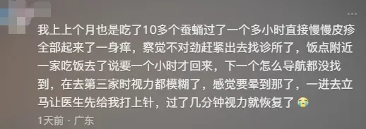 “我吃海鲜、鸡蛋、牛奶都不过敏,没想到这一次吃蚕蛹过敏了!”张先生赶紧服用抗过敏药物,第三天已完全康复。之后,他还去医院检查了过敏原,发现自己属于对异体蛋白过敏人群。
